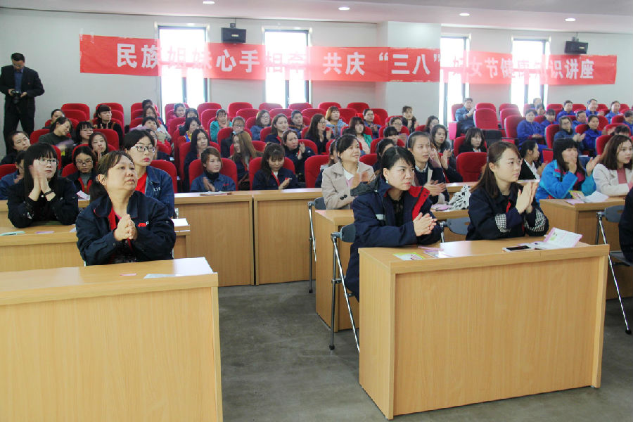3月6日,,,,,,公司工会举行了迎“三八”女员工身心康健专题讲座。。。。。。。。为女员工们送上了一份知心的眷注。。。。。。。。来自公司各岗位150多名女员工代表加入了本次讲座。。。。。。。。讲座特约请石河子开发区医院妇产科主任吴艳主讲,,,,,,开发区工会办公室副主任张萍出席运动并讲话。。。。。。。。